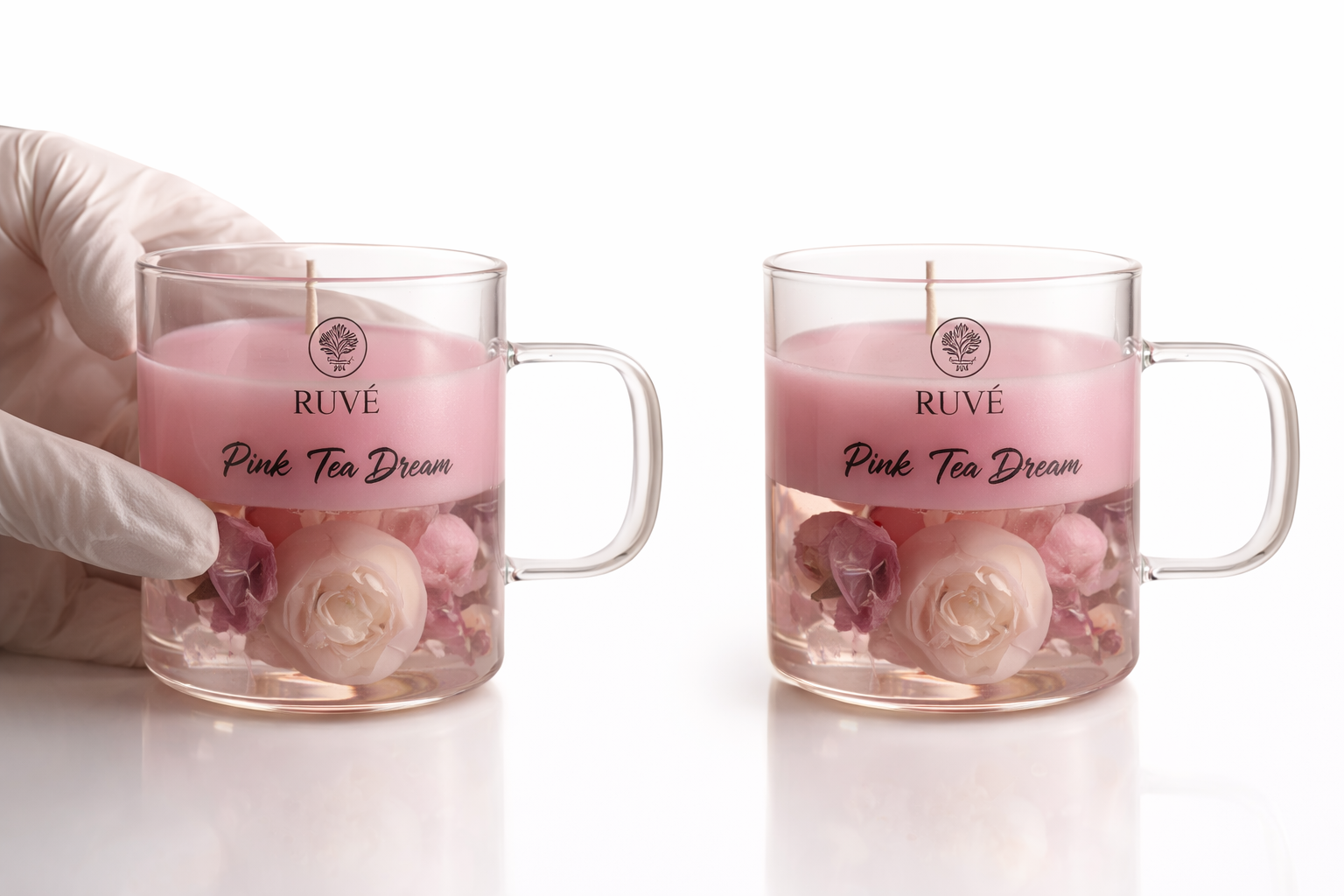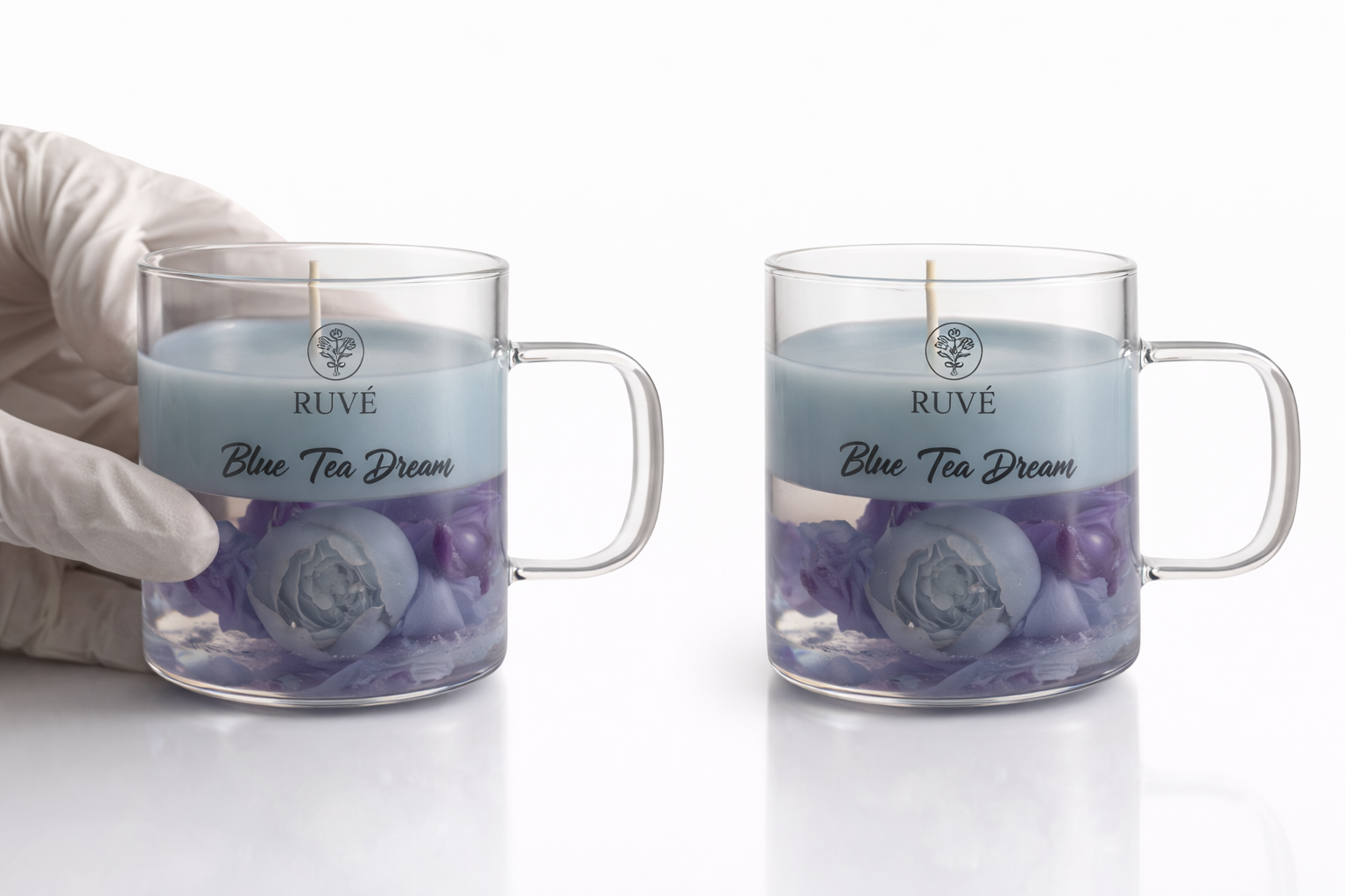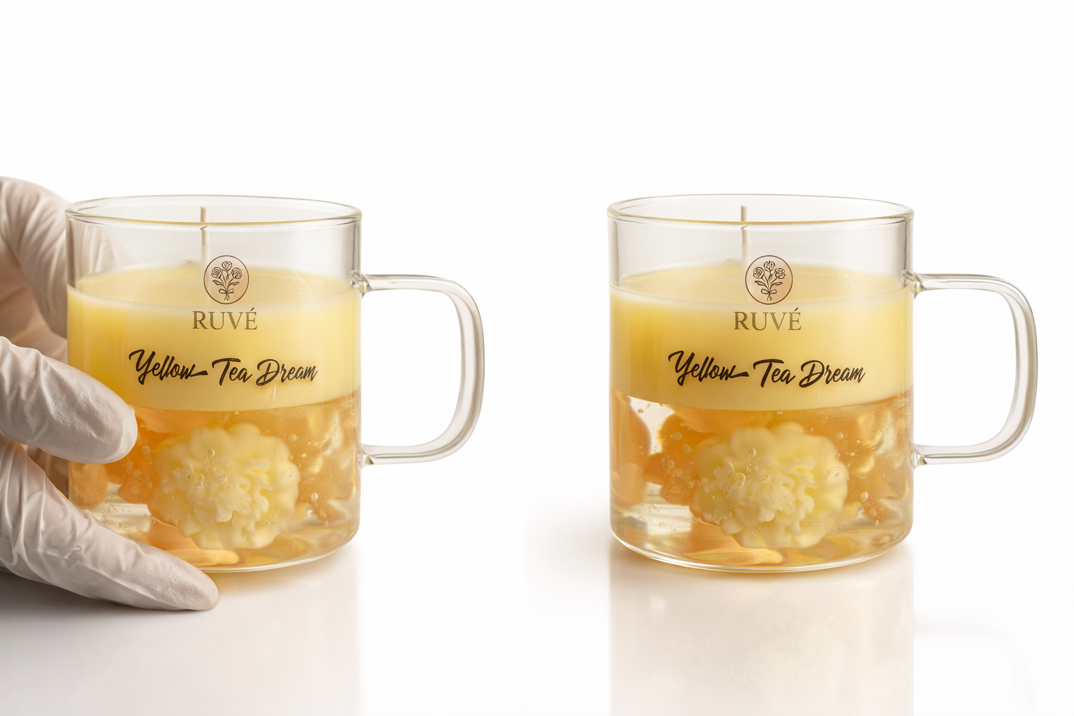 Handgegossene Blütentee Kerzen im Glas. Dekorative Wachs-Blüten in Teelook. Stilvolle Geschenkidee und besondere Wohnraum-Deko von Ruve Giftbox.