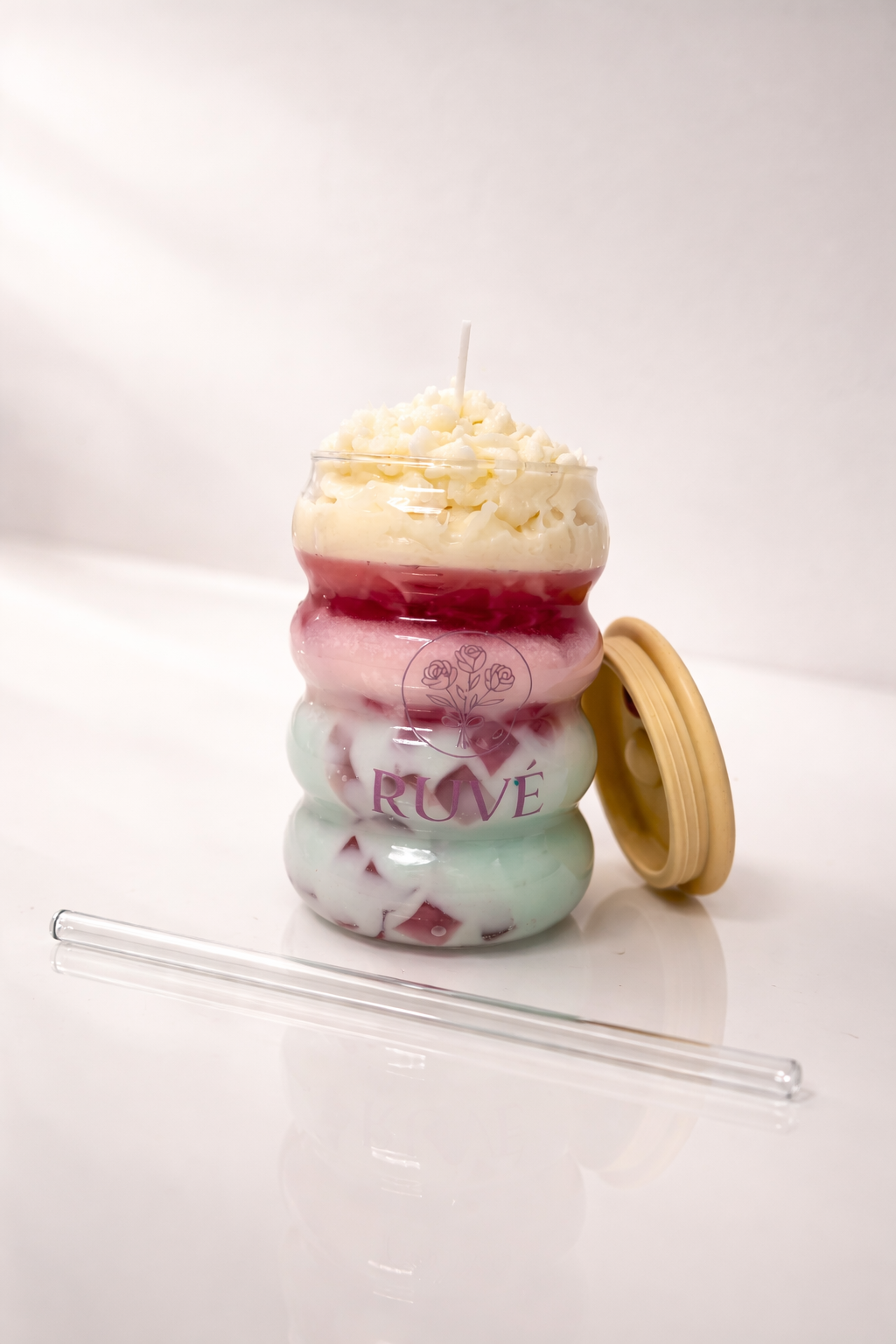 Das besondere Drink-Glas-Design mit geschichtetem Wachs macht diese Kerze zu einem dekorativen Hingucker. Strohhalm und Deckel sind im Set enthalten und unterstreichen den einzigartigen Look.